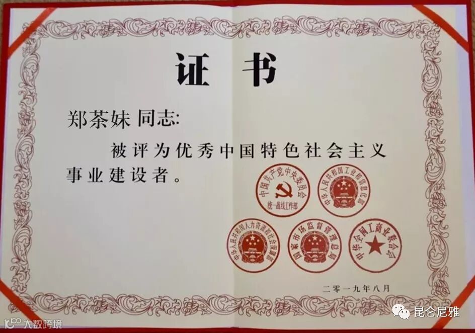 会上,新疆维吾尔自治区工商联副主席、新疆维吾尔自治区政协委员、新疆温州总商会会长、新疆海大集团董事长、新疆昆仑尼雅生态农牧发展有限公司总经理郑茶妹女士,与其他非公有制经济界人士共计100人,被授予“全国非公有制经济人士优秀中国特色社会主义事业建设者”荣誉称号。