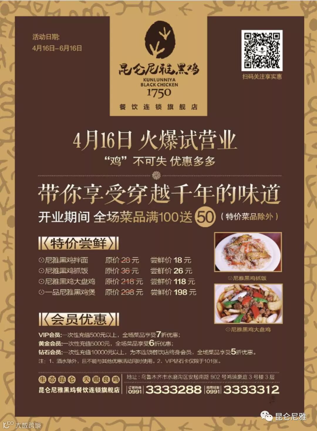 昆仑尼雅黑鸡餐厅旗舰店是新疆昆仑尼雅生态农牧发展有限公司旗下全资子公司投资的第一家餐饮连锁店,本店位于乌鲁木齐市水磨沟区安居南路鸿瑞豪庭3号楼3层,面积1000多平米,内设豪华包厢1间,优雅卡座10间,同时能容200多人就餐,以总公司昆仑尼雅散养的尼雅黑鸡为主要食材,开发尼雅黑鸡系列的新疆特色菜品。同时本店还提供花式调饮、咖啡、茗茶以及民族风情歌舞表演等,以五星级的服务,让你享受家一般的温暖。