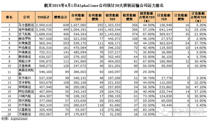 根据咨询公司Alphaliner最新统计,全球20大班轮运输公司排名如下:
