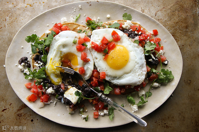 将玉米饼烤2-3分钟,浇上煮好的黑豆、蔬菜碎粒,再放上煎好的鸡蛋就完成了!