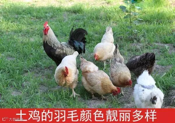 土鸡羽毛颜色多样,异彩纷呈。一批土鸡中羽毛颜色多不一样。羽毛紧凑、滑顺、有光泽。土鸡一般多在成年后出售,从其身上拔毛,羽杆内无毛囊液(营养液),不带血。