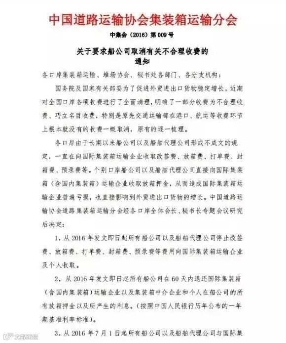中国道路运输协会道路集装箱运输分会要求:从发文即日起所有船公司及船舶代理公司停止改签费、放箱费、打单费、封箱费、预录费等费用向集装箱运输企业及个人收取,并在60天内退还收取的所有的放箱押金及所产生的利息。此外,从2016年7月1日起所有船公司及船舶代理公司与集装箱运输企业直接签订“放箱协议”明确责任。