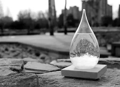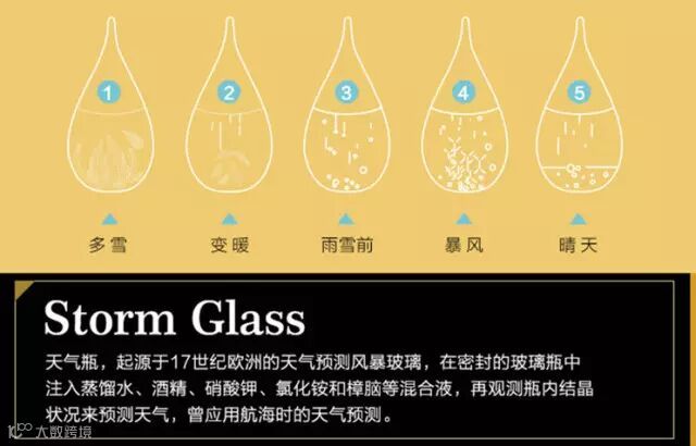的storm glass,在玻璃瓶中注入蒸馏水、酒精、硝酸钾、氯化铵及樟脑等混合液,通过观察瓶内液体的结晶状况来预测天气。现代研究证实,