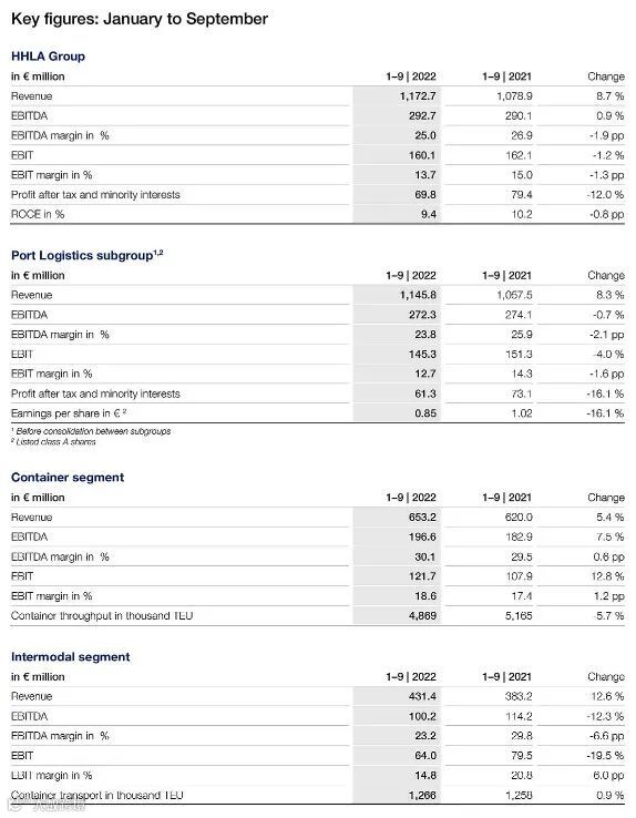 汉堡港口与物流股份公司2022年1-9月重大数据