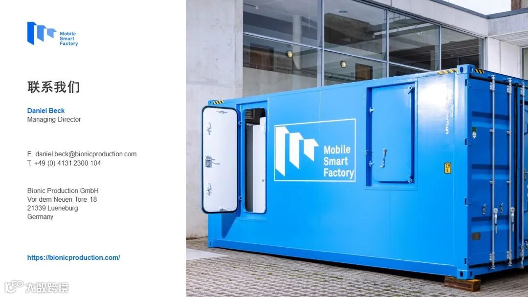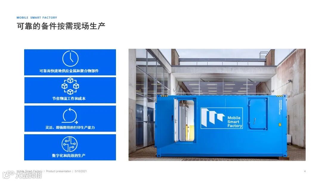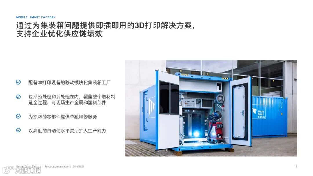 Mobile Smart Factory是配备3D打印设备的模块化集装箱工厂,可在任何需要的地方提供灵活而可靠的生产能力。通过覆盖整个增材制造过程,包括预处理和后处理,它可以经济高效地快速供应金属和塑料零件。