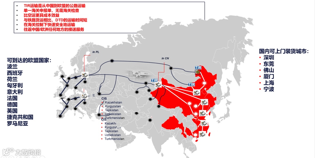 欧洲卡车服务与传统意义上的中国货车的区别,在于境外车辆和驾驶员,可 直接进入中国境内,甚至可以到内地的厂家和仓库装货,然后出境。不同的是,今年受疫情影响,所以从境外来的司机,要向有关部门报备,然后在海关等待检疫结束之后,方可入境,把货物从中国运往欧洲,这种服务的名称叫TIR运输。
