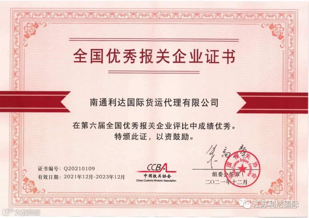 2021年利达国际荣获“第六届全国优秀报关企业”称号。
