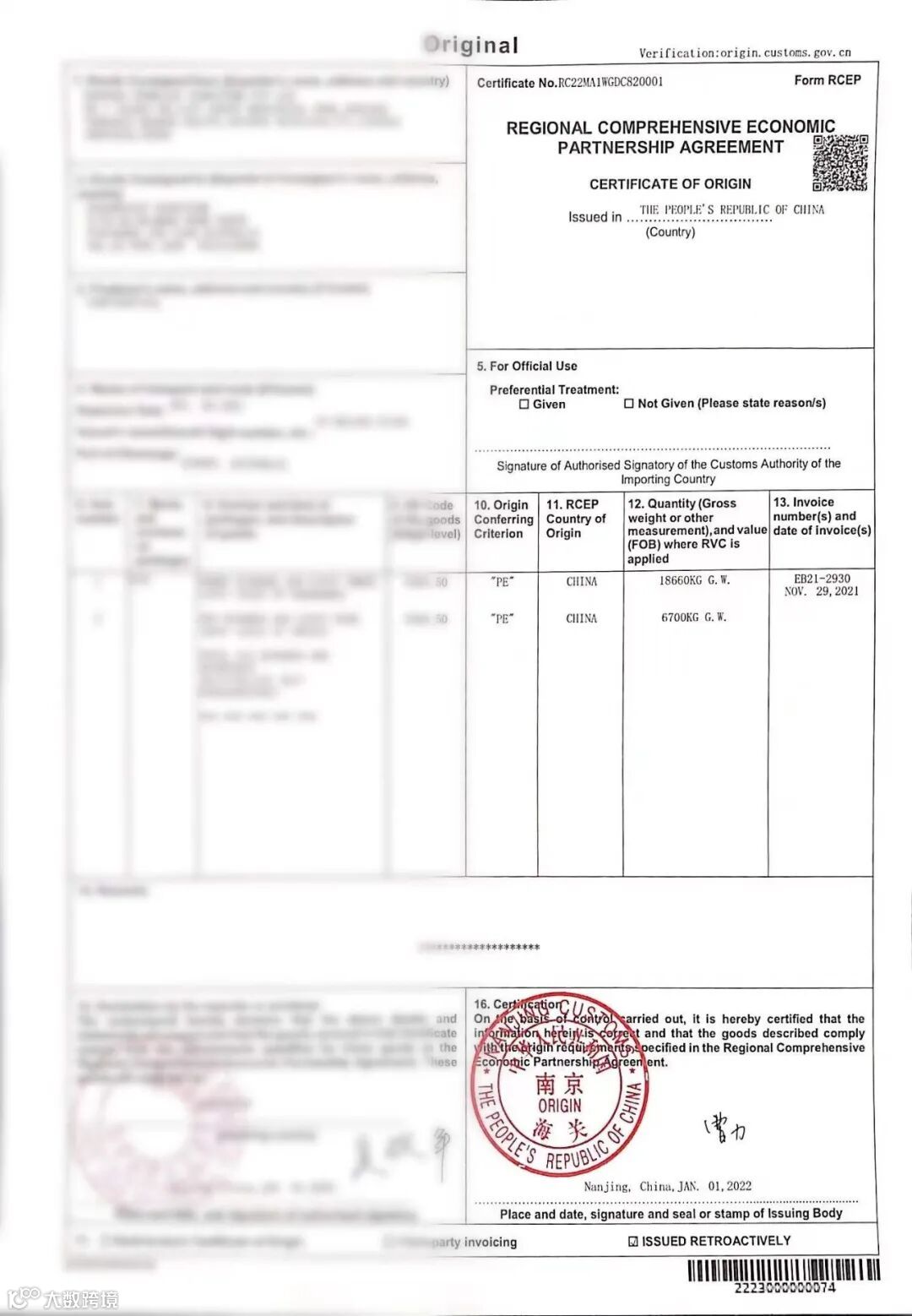 全力配合海关助力企业尽快融入RCEP“朋友圈”,代理海安、如东地区第一份RCEP证书出证。