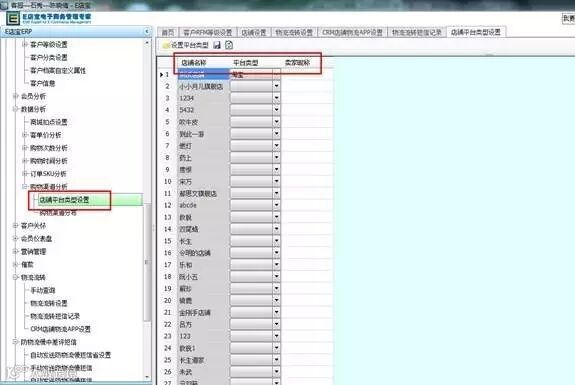 (1)首先在购物渠道分析-店铺平台类型设置界面,设置好店铺的平台类型,这里只支持淘宝平台的店铺