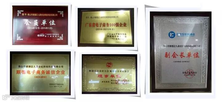 2015在全体小伙伴的努力下,九鼎获得了广东商电子商务100强企业,顺德区电子商务示范企业,顺德区星光企业,顺德区电子商务协会副会长单位,顺德电子商务诚信企业,淘搭档等殊荣。