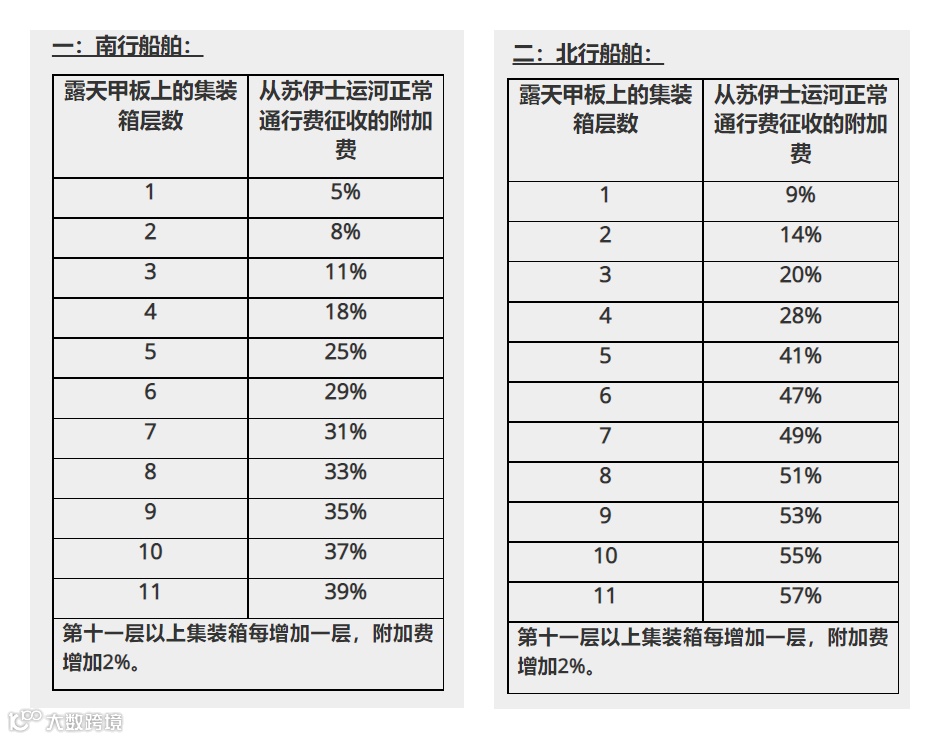 对通过苏伊士运河的北行“集装箱船”,同样按照集装箱层数收取附加费,比例调整为通行费的9%-57%。