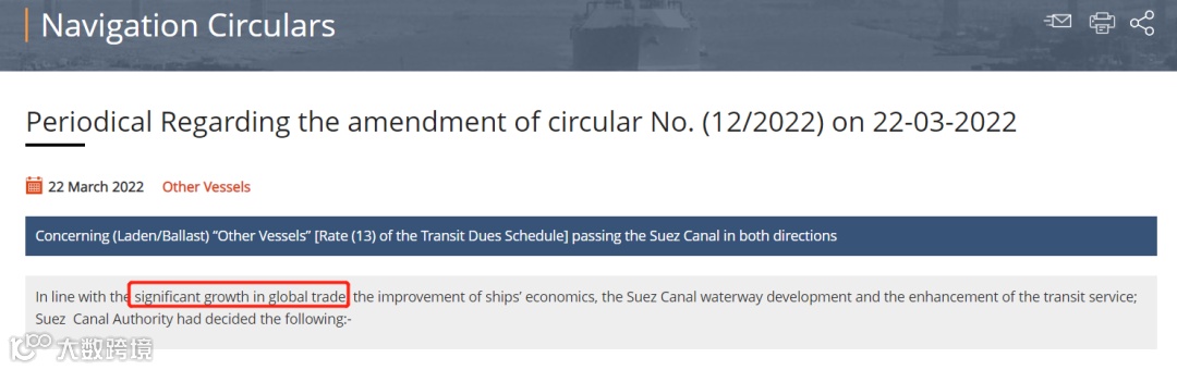当时拉比耶表示此次涨价(6%)预计将为运河每年额外筹集 4 亿美元,这个数字就已经是工程成本的两倍了。那么自2月以来的两次涨价,合计约16%左右的涨幅,其更可能是想从2022年的贸易量中多分一杯羹,也即其在官网提到的四条理由中的第一条:全球贸易的显著增长。