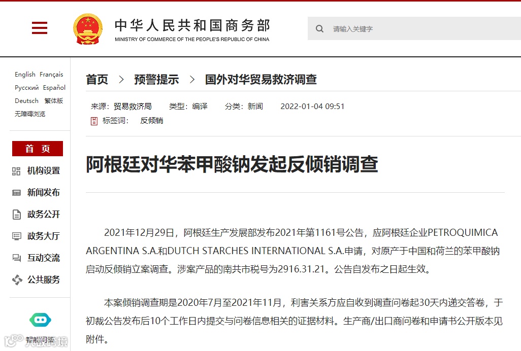 2021年12月29日,阿根廷生产发展部发布2021年第1161号公告,应阿根廷企业PETROQUIMICA ARGENTINA S.A.和DUTCH STARCHES INTERNATIONAL S.A.申请,对原产于中国和荷兰的苯甲酸钠启动反倾销立案调查。涉案产品的南共市税号为2916.31.21。公告自发布之日起生效。