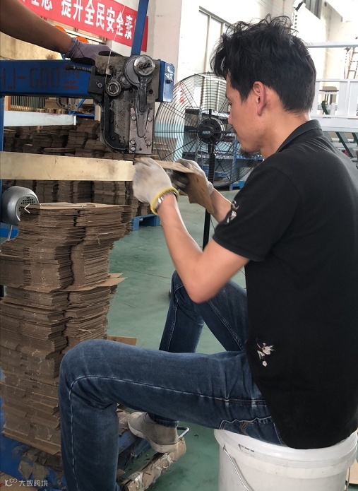 ① 用钉箱机接合:钉箱是纸箱接合成箱的一种方式,目前钉 箱机的种类有人工、半自动、全自动方式。人工钉箱时,首尾钉距及钉距均匀性均由操作人的熟练程度来掌握,劳动强度大,且生产效率不高。半自动及全自动钉箱机,降低了工人的强度,同时提高其钉距的均匀度,提高产品的质量