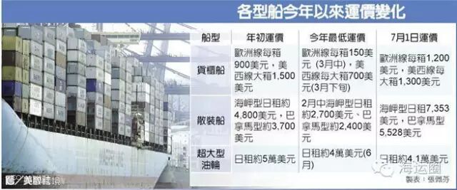 上周五上海航运交易所公布的数字显示,欧美线运价都大幅上涨,上海运往欧洲基本港的运价,自每箱(20呎柜)680美元提高为1,206美元,美国西岸自每大箱(40呎柜)735美元提高为1,209美元,涨幅分别为77.4%与60.6%。以台湾揽货业者数据,欧洲线是从500~600美元起涨,美西线是从650美元起涨,都是翻倍上涨。