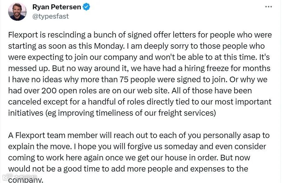 Ryan Petersen推特上写道:“Flexport取消了一系列为本周一开始上班的人签署的录取通知书。我对那些原本希望加入我们公司但现在却无法加入的人深表歉意。”