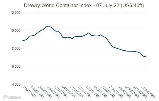 除了FBX指数外,以亚美、亚欧和欧美8条主要航线为参考的德鲁里世界集装箱综合运价指数(WCI)也正出现全线下跌的情况。