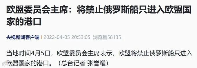 4月5日,欧盟委员会主席冯德莱恩在社交媒体表示,委员会已经提出了第五套针对俄罗斯的制裁措施,将禁止俄罗斯船只进入欧盟国家的港口。