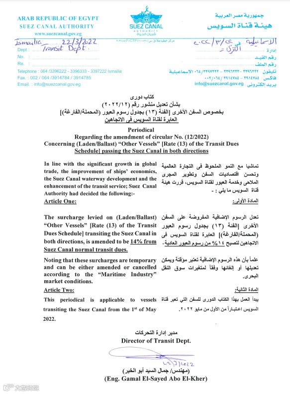 苏伊士运河管理局表示,新一轮定价将从5月1日起生效,之后可能会根据全球航运情况的变化再做调整。