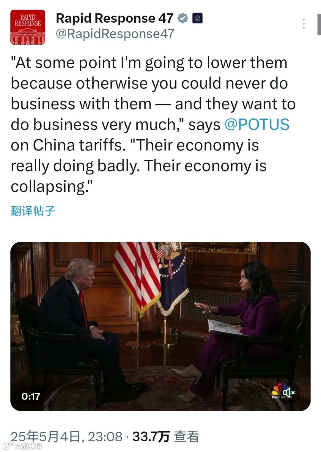 特朗普说道:“在某个时候我会降低关税,否则你们永远无法和他们(中国)做生意——而他们非常想做生意。”