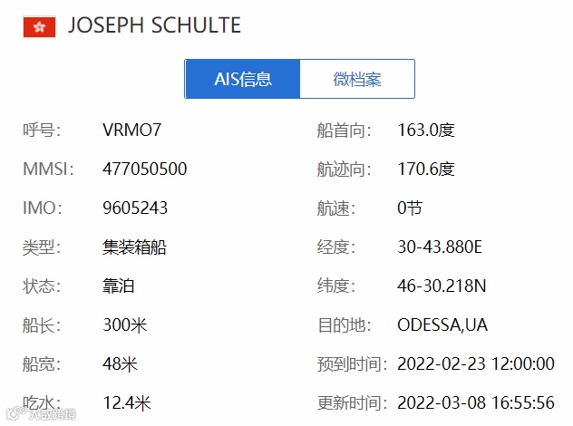 根据最新船舶动态显示,海洋联盟此前靠泊在敖德萨码头的集装箱船 “Joseph Schulte”,目前依旧停靠该码头,已超过14天,船期严重延误。