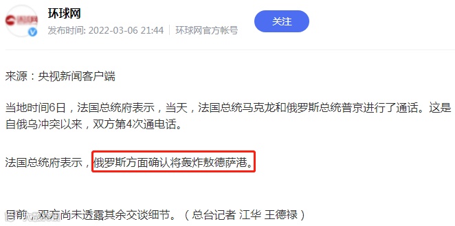 法国总统府表示,俄罗斯方面确认将轰炸敖德萨港。