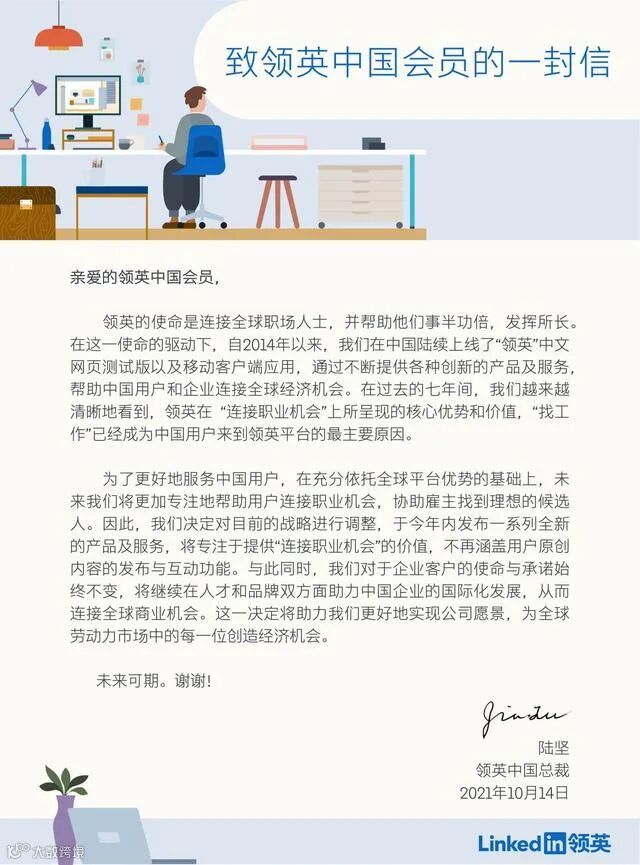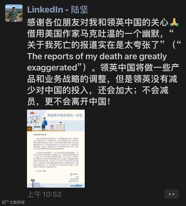 领英中国总裁陆坚朋友圈回应“领英中国关闭”传闻称: