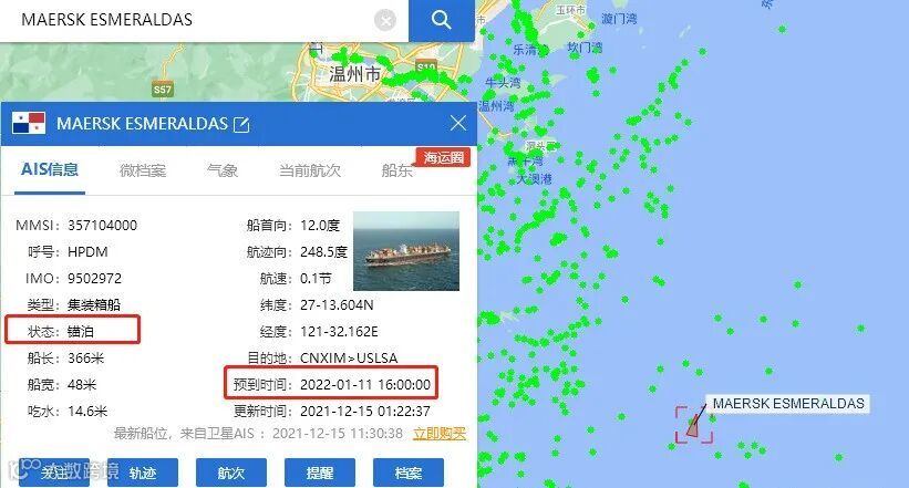 集装箱船“Maersk Esmeraldas”(13000teu)于12月1日离开厦门港,目前锚泊在离我国海岸线不远的海域,计划于1月11日抵达洛杉矶,过境时间一个多月。该船还曾挂靠香港、深圳、盐田。