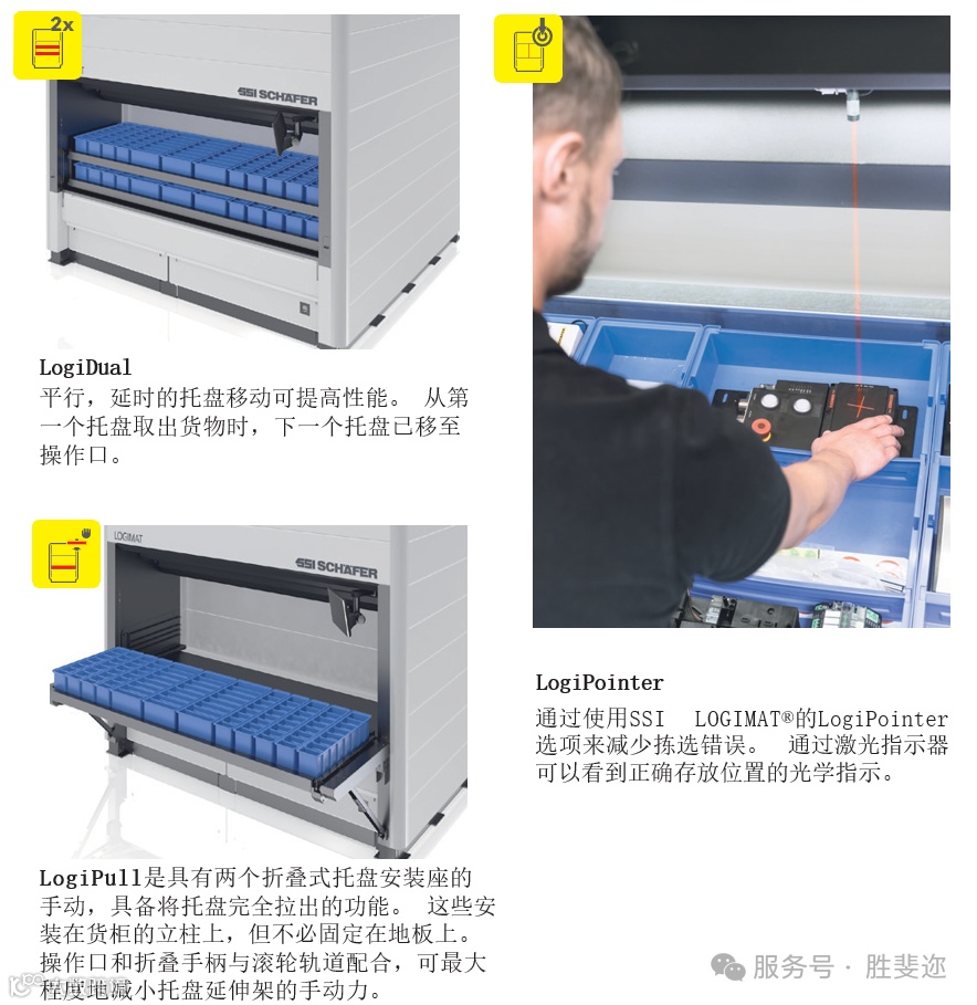 SSI LOGIMAT®垂直升降货柜类似于一个超大抽屉柜,带有两叠托盘,一个在前面,一个在后面。在两排托盘之间是一台提升机。该提升机贯穿整个升降货柜,从各个存储位置取出一个单独的托盘并将其传送至操作口。
