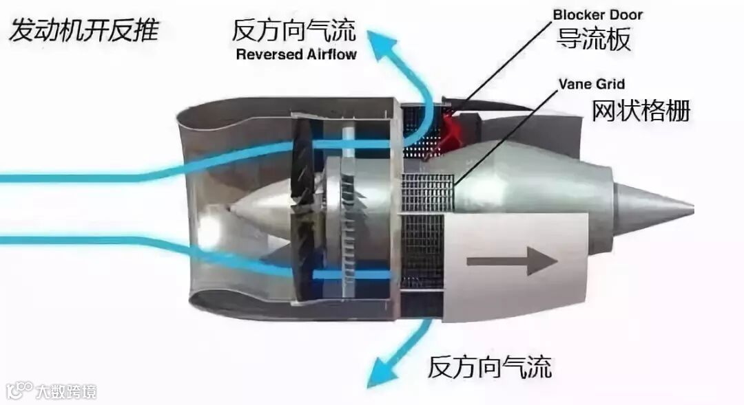 飞机发动机反推装置的原理是用导流板使发动机排气的方向发生偏转,倾斜向前方喷气,以产生向后的拉力使飞机在着陆滑跑过程更快地减速。