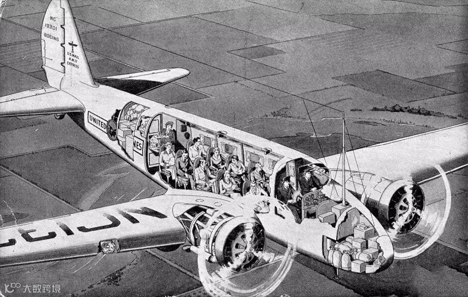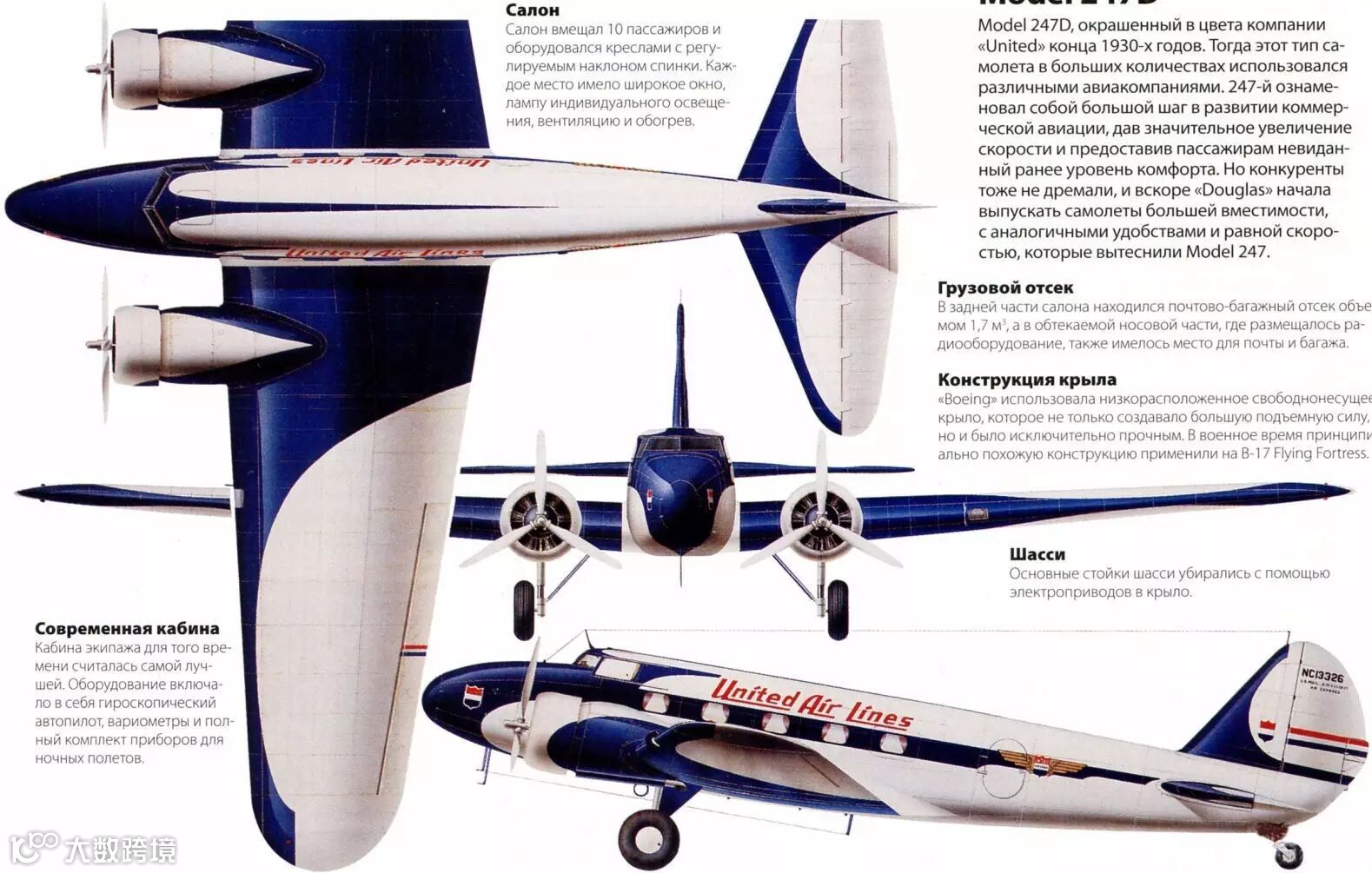 1933年2月8日,具有流线型外观的全金属下单翼双发客机波音247首次翱翔蓝天,就被人们誉为是“第一种现代客机”。