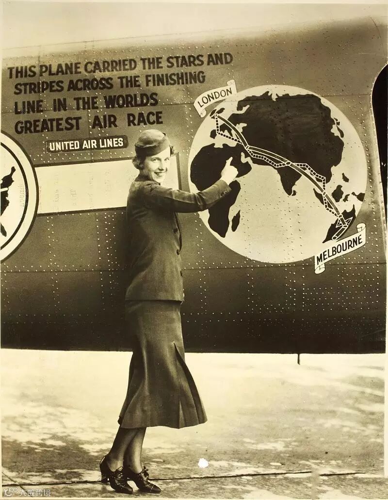 波音247获得过飞行竞赛大奖,空乘所指的标志是伦敦到默尔本航线竞速获胜标志。