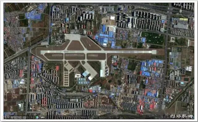 南苑机场,在北京城的正南方,很靠近中轴线,照片上绕机场而过的公路就是南五环。目前为军民两用机场,联合航空公司、华美邮航的基地就设在南苑机场。南苑机场跑道长2900米,起降条件优于西郊、沙河机场及民航管辖的首都机场,也是中外政要专机在北京地区主要的起降机场。