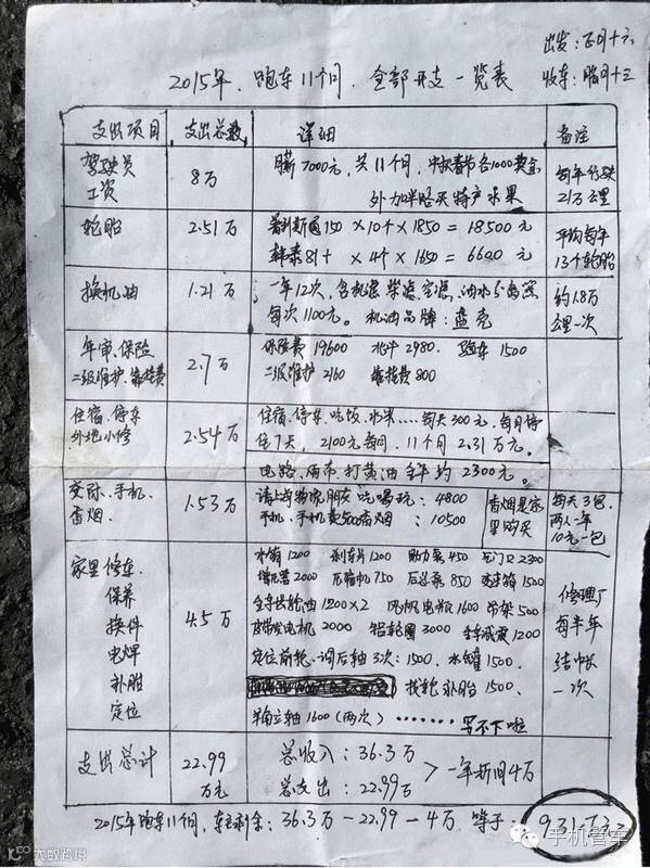 杨师傅的车挂靠在运输车队,2015年上海到乌鲁木齐一共23个往返,全年毛利36.3万元,但是扣除22.99万的开支和4万的折旧,一年的纯利只有9.31万。