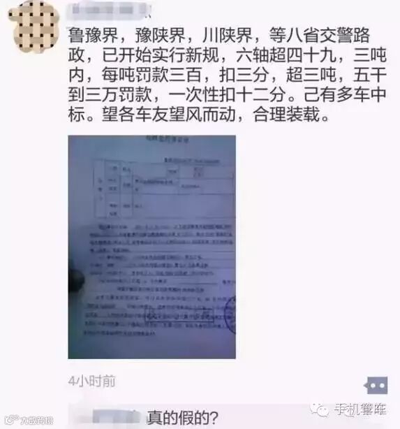 治超规定的出台在货运市场掀起轩然大波,现在距离有关部门上路执法时间已经只有12天了。今天,有一则消息在卡友微信朋友圈里炸开了锅!消息称,鲁豫界、豫陕界、川陕界等八省交警路政,已开始实行新规,六轴车超过49吨,三吨内,每吨罚款300元,扣三分,超过3吨,罚款5000到30000元,驾驶本一次性扣12分,已有多车“中标”!
