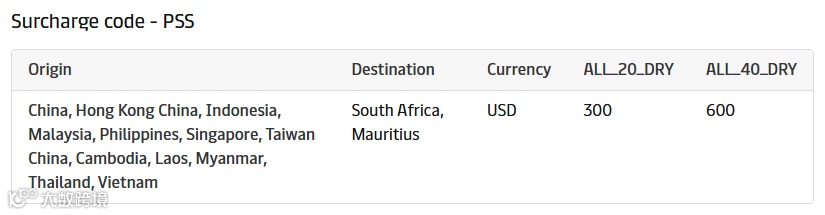 自2026年1月1日起,马士基将对中国、中国香港及东南亚多国(包括印尼、马来西亚、菲律宾、新加坡、泰国、越南等)至南非及毛里求斯航线征收旺季附加费(PSS),具体标准为:20英尺干货箱300美元,40英尺干货箱600美元,有效期至另行通知。