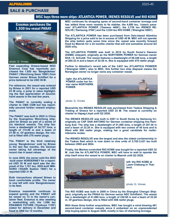 (注:有船舶经纪人士透露,MSC可能并非ATLANTICA POWER轮的实际买家,RIO KOBE交易亦未最终确认。但基于Alphaliner报告内容,本文仍以公开信息为准。)