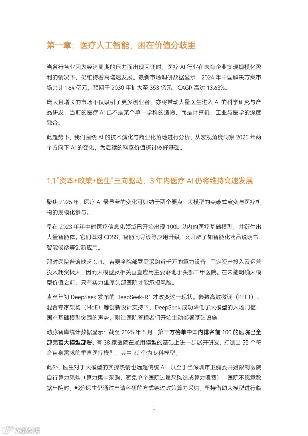 医疗人工智能行业在资本、政策与医生需求的共同推动下持续高速增长。2024年中国医疗AI解决方案市场规模达164亿元,预计2030年将增至353亿元,复合年均增长率(CAGR)为13.63%。尽管增长势头强劲,行业仍普遍面临规模化盈利难题,核心挑战在于患者获益与科室效益之间的价值失衡,制约了技术的商业化进程。