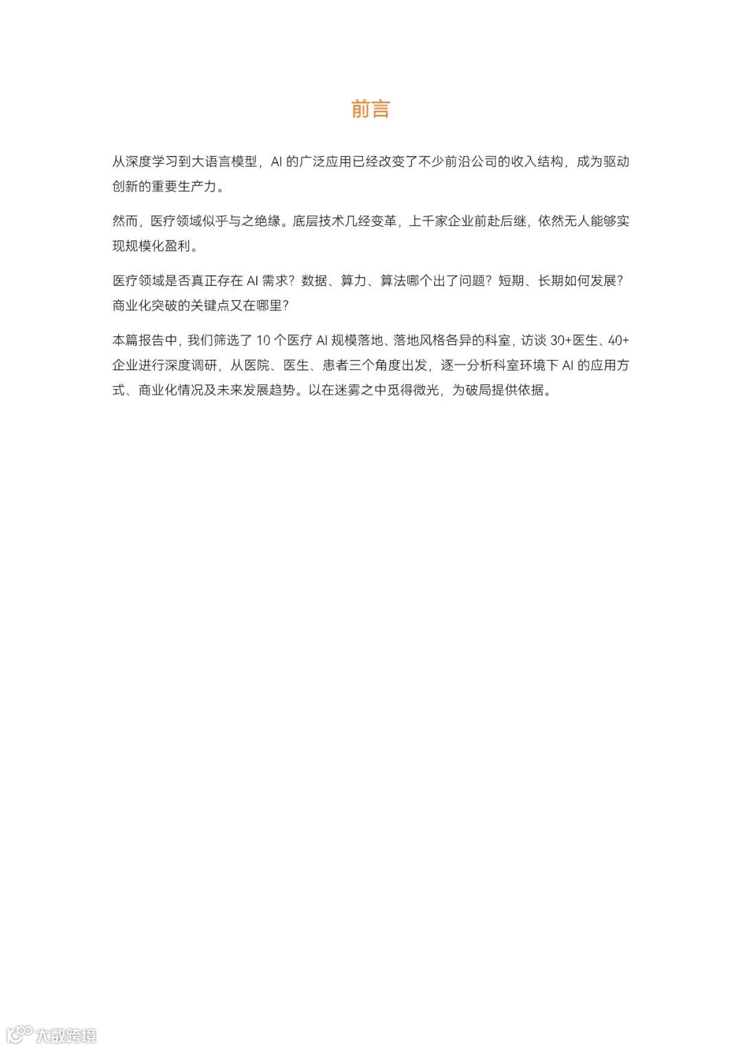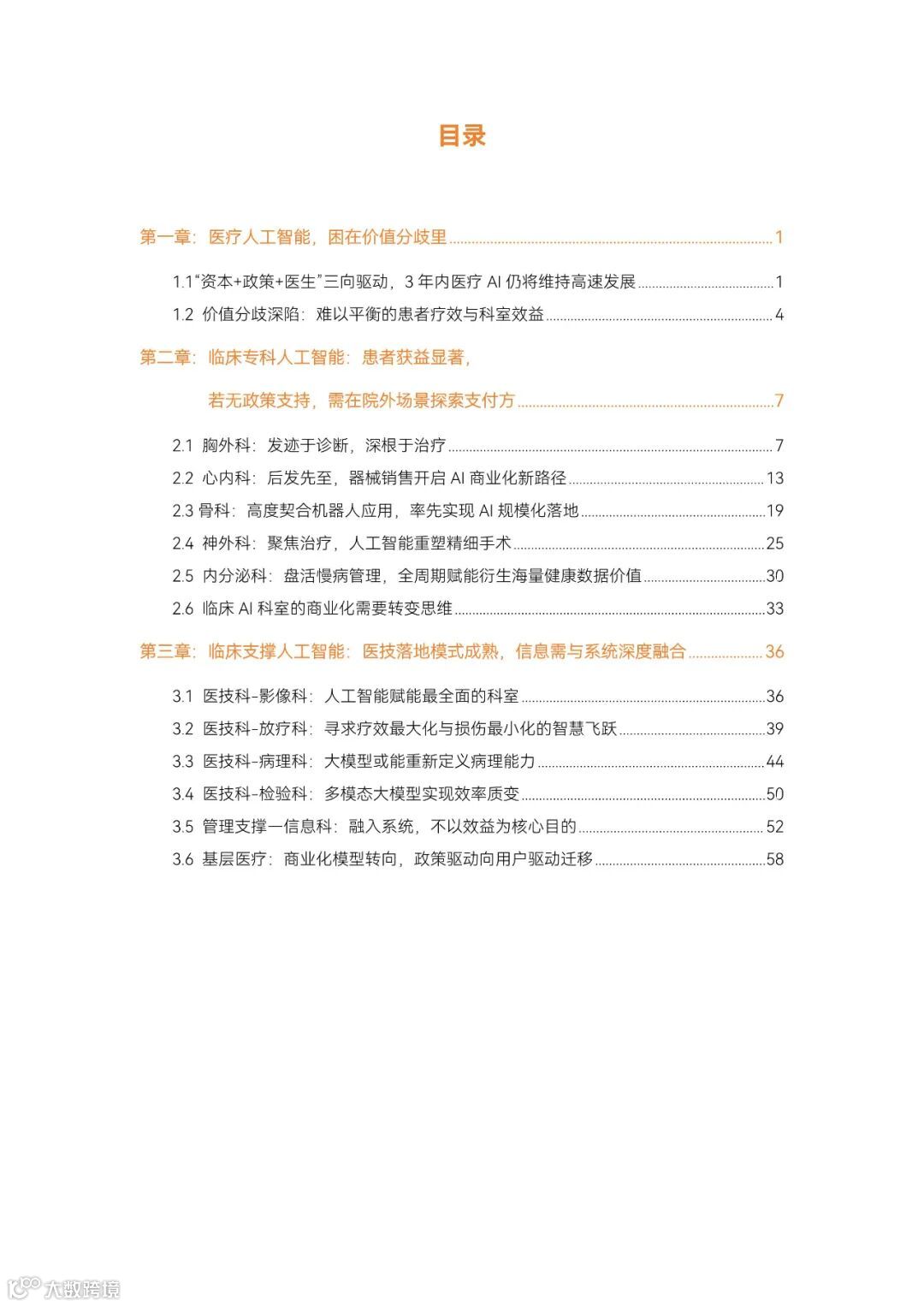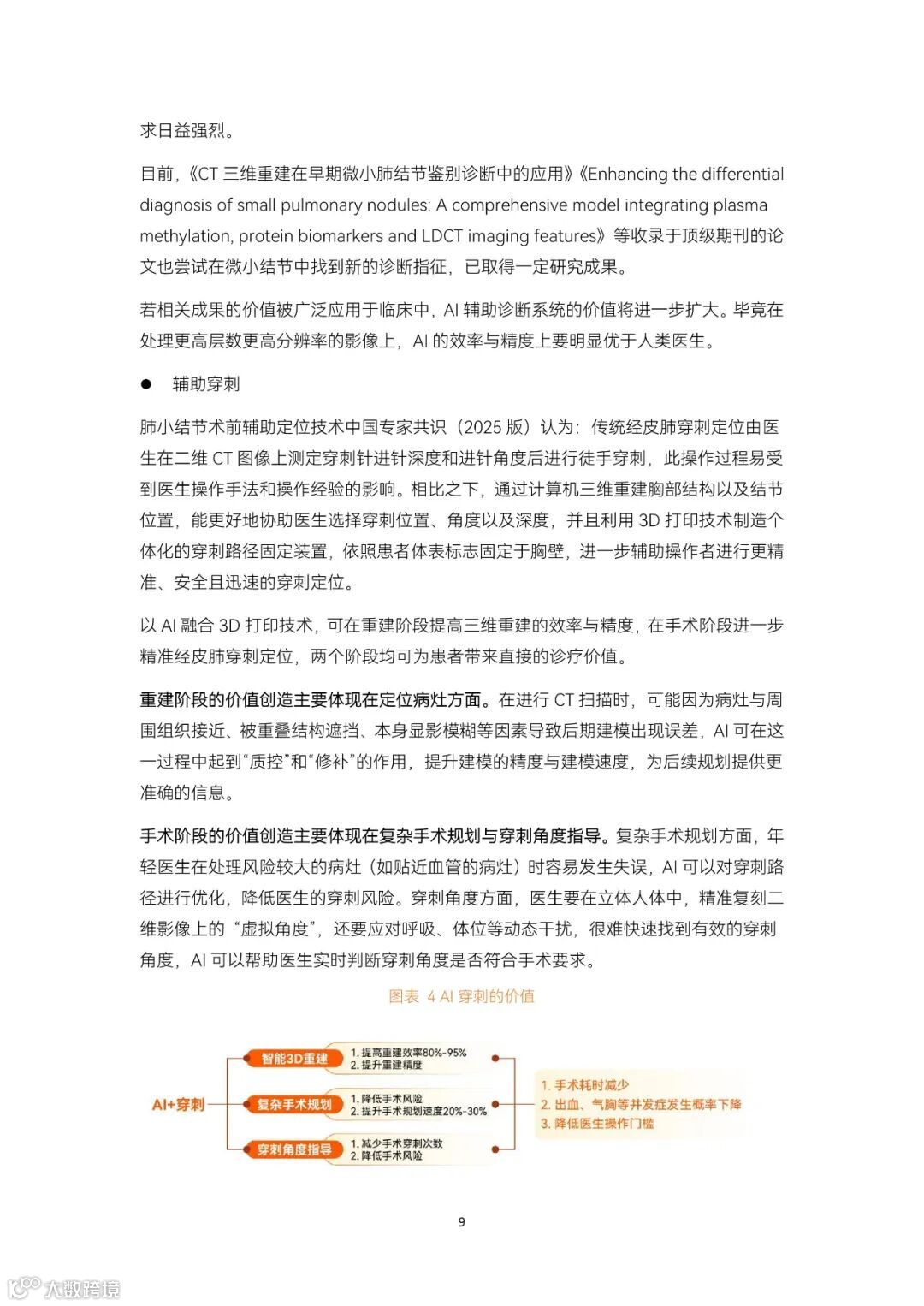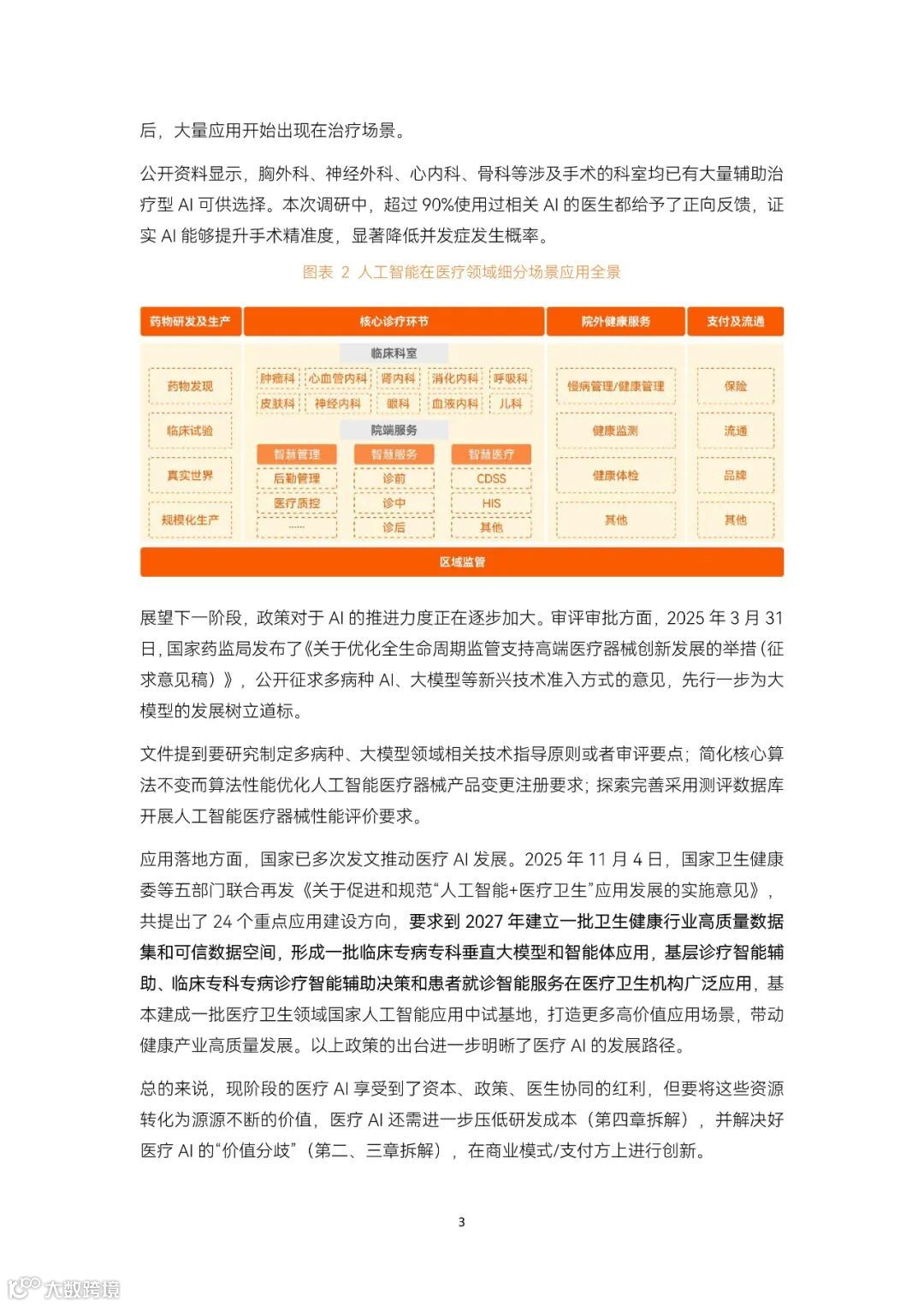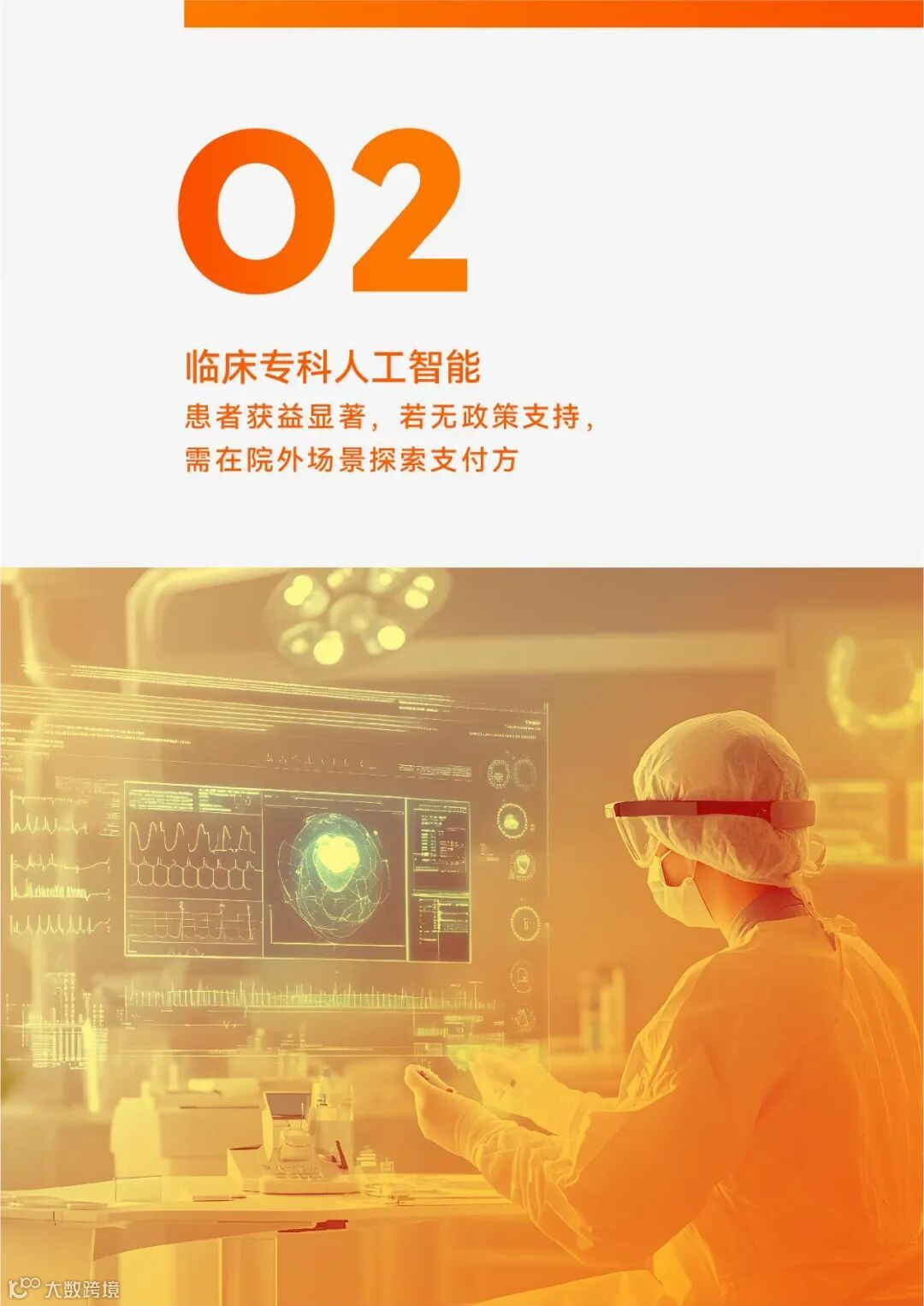 胸外科、心内科、骨科、神外科、内分泌科等临床专科已成为医疗AI的核心应用场景,实现从诊断、治疗到术前规划与术后康复的全流程覆盖。AI显著提升了诊疗效率与精准度,例如胸外科AI辅助阅片效率提升56%-84%,骨科手术机器人推动复杂手术规模化开展,内分泌科AI助力慢病全周期管理。然而,专科AI的商业化仍需突破支付瓶颈,尤其在缺乏政策支持的场景下,探索院外支付模式成为关键方向。