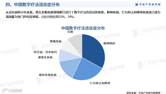 从适应症分布看,精神疾病和行为认知障碍已成为我国数字疗法布局的重点方向,占比分别为33%和24%,表明相关疾病领域的数字化干预需求持续上升。