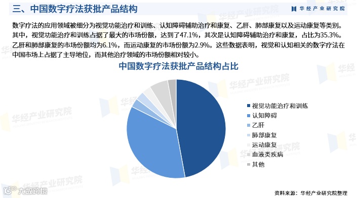 数字疗法的应用领域主要包括视觉功能治疗与训练、认知障碍辅助治疗与康复、乙肝、肺部康复及运动康复等。其中,视觉功能治疗与训练占据最大市场份额,达47.1%,认知障碍相关治疗占比35.3%。乙肝与肺部康复各占6.1%,运动康复为2.9%。数据显示,视觉与认知类数字疗法在中国市场居主导地位,其他领域份额相对较小。
