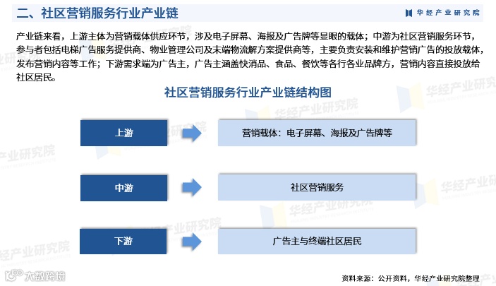 社区营销服务产业链分为三部分:上游为广告载体供应,包括电子屏幕、海报架、广告牌等设备;中游为营销服务实施环节,涵盖电梯广告运营商、物业公司及末端物流解决方案提供商,负责广告载体的安装维护与内容发布;下游为广告主需求端,覆盖快消品、食品、餐饮等多个行业的品牌方,广告直接面向社区居民投放。