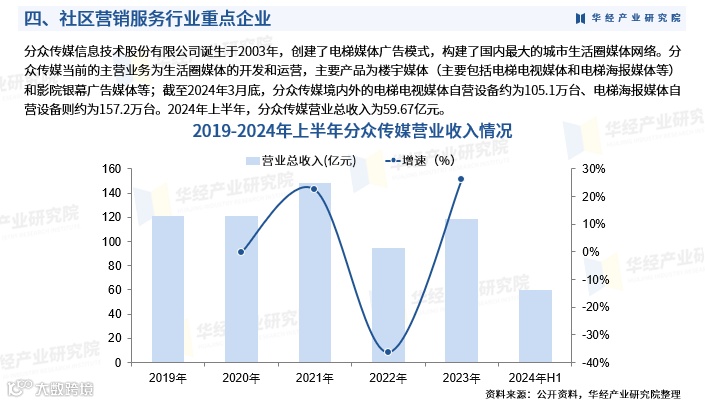 分众传媒成立于2003年,开创了电梯媒体广告模式,现已成为国内最大的城市生活圈媒体网络运营企业。公司主营楼宇媒体(含电梯电视、电梯海报)和影院银幕广告。截至2024年3月,其境内及海外自营电梯电视设备约105.1万台,电梯海报设备约157.2万台。2024年上半年,公司实现营业总收入59.67亿元。