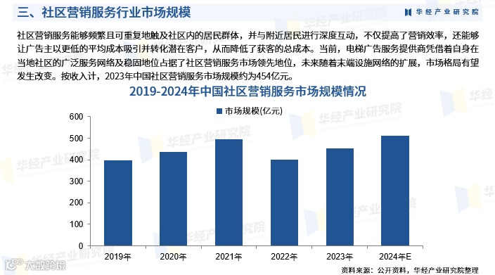 该模式凭借高频次、可重复触达社区居民的优势,实现高效互动,提升转化率并降低获客成本。目前,电梯广告服务商凭借广泛的社区网络占据市场主导地位。随着末端设施布局扩展,市场竞争格局或将重塑。按收入统计,2023年中国社区营销服务市场规模约为454亿元。