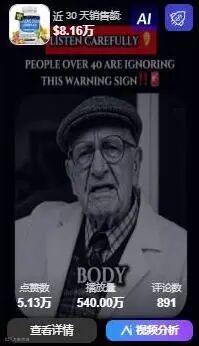 在美区市场,AI视频持续催生爆款。一款保健品AI视频上线仅11天,实现540万播放量、5468单销量,销售额突破8.16万美元(约人民币57万元)。该视频通过AI技术塑造一位资深“智者”形象,制造健康危机感,精准触达消费者焦虑点,有效激发购买意愿。