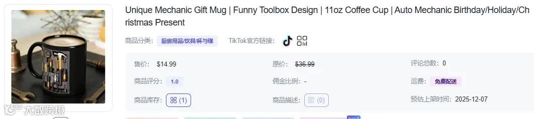 另一款嵌入微缩维修工具的工业风咖啡杯,12月7日上架,售价14.99美元,精准定位机械爱好者群体。通过两条AI视频展示细节,仅480万播放量即带动销量达3889单,销售额5.83万美元(约人民币40万元)。