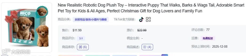 家居品类同样表现亮眼。一款机器狗玩具自12月8日上架后,不到20天售出3.04万件,销售额达36.48万美元(约人民币255万元),其中81%订单由AI视频带动。AI视频生动展示产品“会叫能动”的特点,突出高性价比,深受达人与儿童喜爱。一条播放量330万的视频直接贡献23万美元销售额。