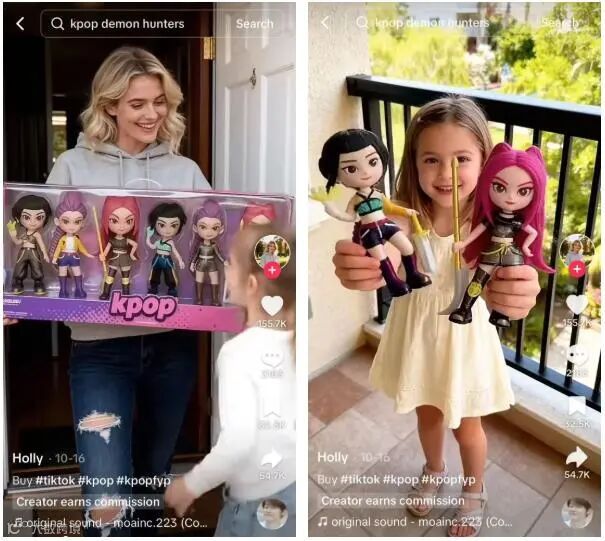 虚拟周边品类亦表现不俗。主打K-pop周边玩具的AI账号@Holly,通过“小孩拆礼物”AI场景,单条视频播放量超2400万,GMV超20万美元。