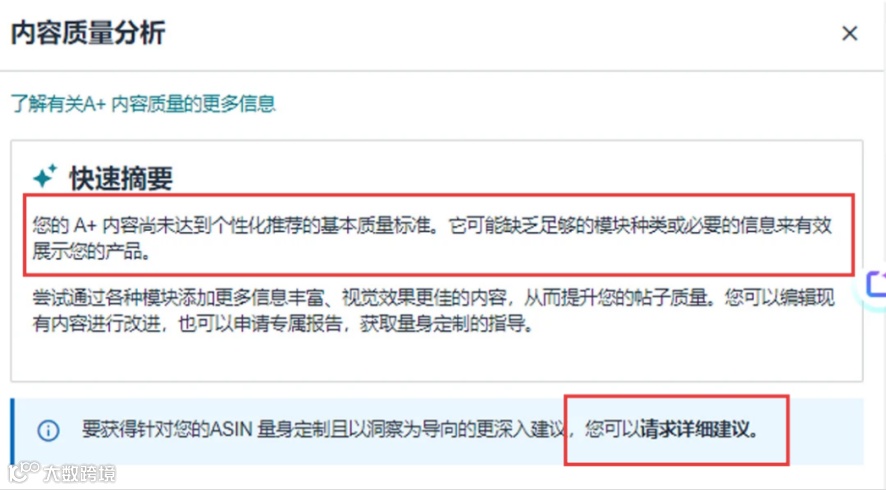简单理解,这是一项专门针对 A+ 内容的质量评估工具,用于判断当前 ASIN 的 A+ 是否达到了平台推荐和个性化展示的基础门槛。