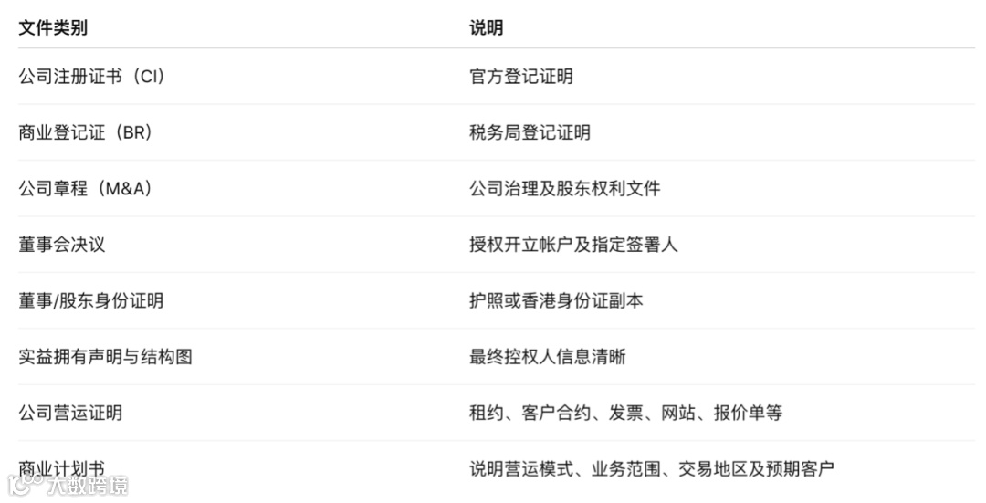 公司账户:注册证书、经公证的翻译件、商业计划书、董事/股东身份证明、银行推荐信及运营资料
